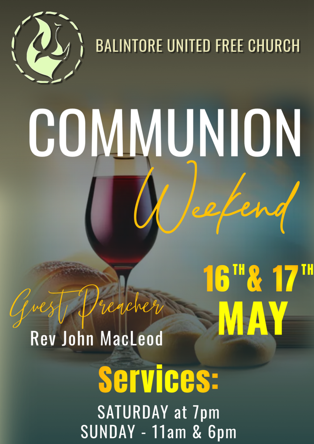 We warmly invite you to join us for our Communion Season on Saturday 16th and Sunday 17th May, a special time set apart to remember the Lord Jesus Christ, to seek His face, and to be refreshed together as His people. We are delighted to welcome Rev John MacLeod as our guest preacher. John is originally from the Isle of Harris and has served as Pastor of Allander Evangelical Church in Milngavie since 2009, having previously ministered in Newmilns, Ayrshire, and as Interim Pastor in Nassau, Bahamas.