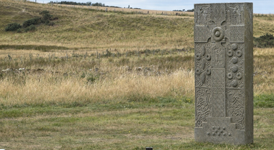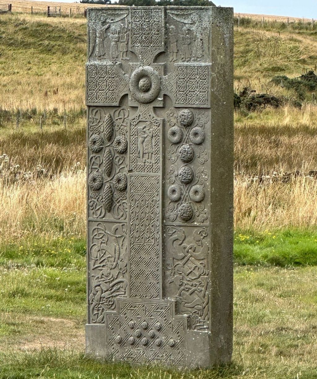 The stone is renowned for its extraordinary carved hunting scene — unusual among Pictish monuments for placing a woman at the centre of the composition. The detail and movement in the carving reflect exceptional craftsmanship and hint at the status and identity of the person commemorated. Today, the original cross-slab is preserved in the National Museum of Scotland in Edinburgh, where its artistry can be appreciated up close. A carefully made replica now stands near the chapel site at Hilton of Cadboll, allowing visitors to imagine how the monument once looked in its coastal setting.